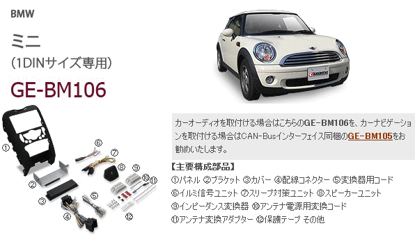 【送料無料】カナック(Kanatechs) GE?BM106 BMW ミニ カーAV/オーディオ取付キット 価格: 29,350円 レビュー評価: 0.0 レビュー数:0 カナック企画 Kanatechs カナテックス GE?BM106 BMW MINI用 カーオーディオ取付キットBMWミニに1DINサイズのカーAVを取付けることができるカーAVトレードインキットです。【主要構成部品】(1)パネル(2)ブラケット(3)カバー(4)配線コネクター(5)変換器用コード(6)イルミ信号ユニット(7)スリープ対策ユニット(8)スピーカーユニット(9)インピーダンス変換器(10)アンテナ電源用変換コード(11)アンテナ変換アダプター(12)保護テープ その他 カーオーディオを取付ける場合はこちらのGE-BM106を、カーナビゲーションを取付ける場合はCAN-Busイン Supported by 楽天ウェブサービス |